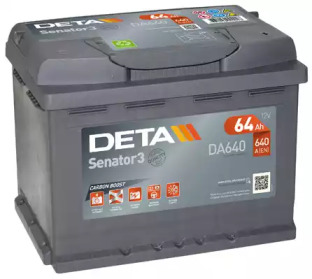 Battery Brand: DETA Battery Code: DA640 Voltage: 12 V Battery Capacity: 64 AH Cold Cranking Amps (CCA): 640 A Length: 242 Width: 175 Height: 190 Post Positions: 0 Terminal Type: EN Hold-down Type: B13 | |